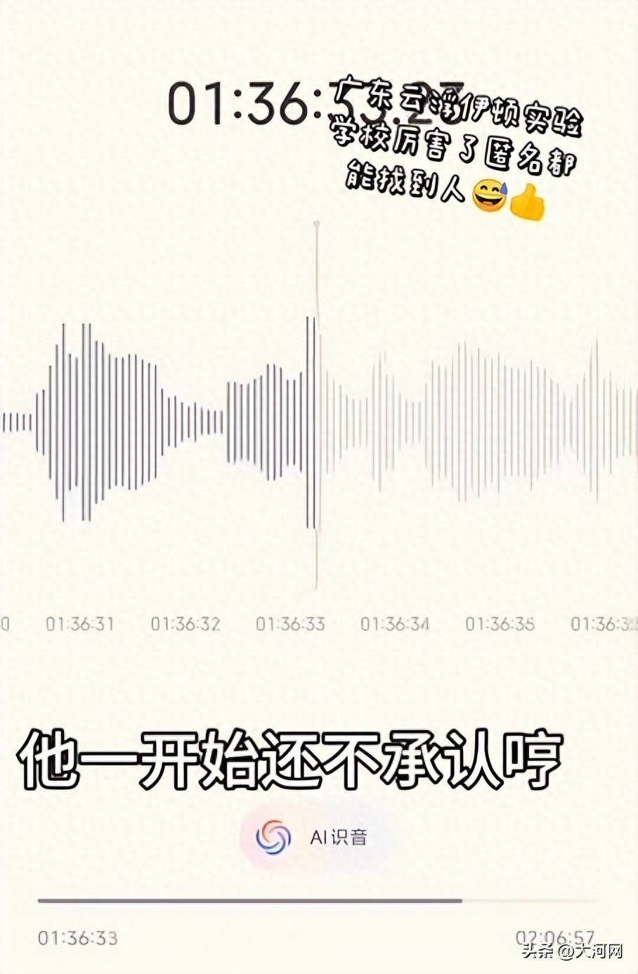 网传音频中,有一位疑似学校工作人员称,有人上午投诉学校,下午学校就知情,并找到该学生:“他后来还迷着,说学校咋知道的,他一开始还不承认。”视频中,该工作人员还疑似发出哼笑。