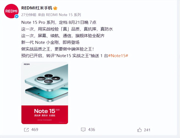 今日,红米官方微博正式官宣 Note 15 Pro 系列将于 8 月 21 日晚 7 点正式发布。此次发布以 “实战检验‘真’品质” 为核心,着重强调了手机的 “真抗摔,真防水” 特性,同时在屏幕、续航、通信等方面配备旗舰级体验,立志重塑中端机市场格局,新一代 Note 小金刚呼之欲出。